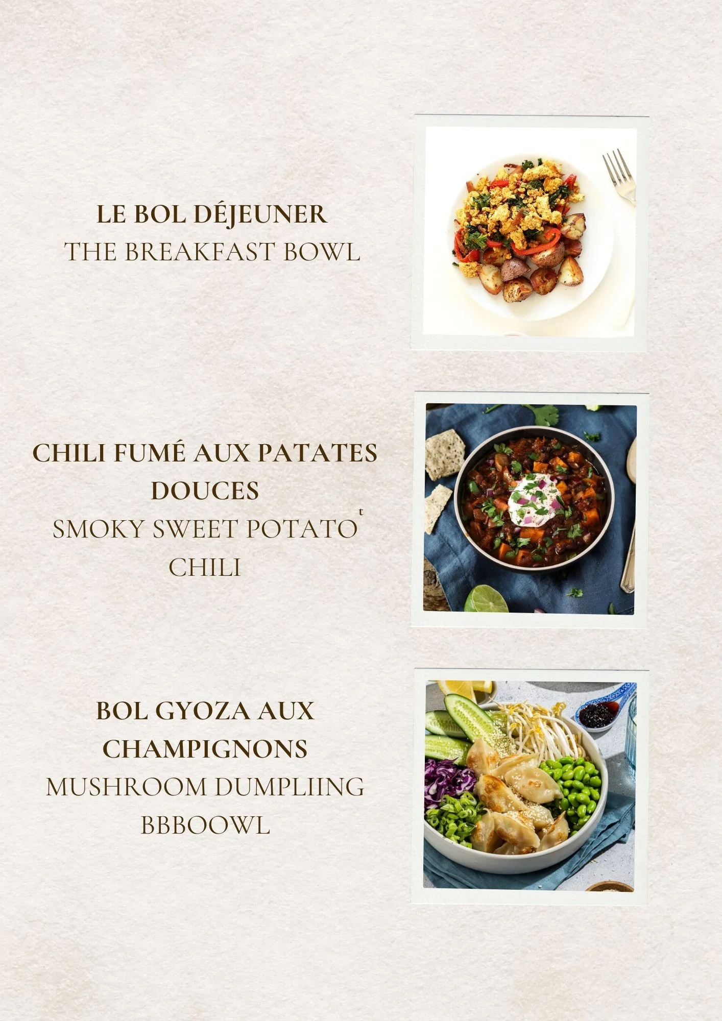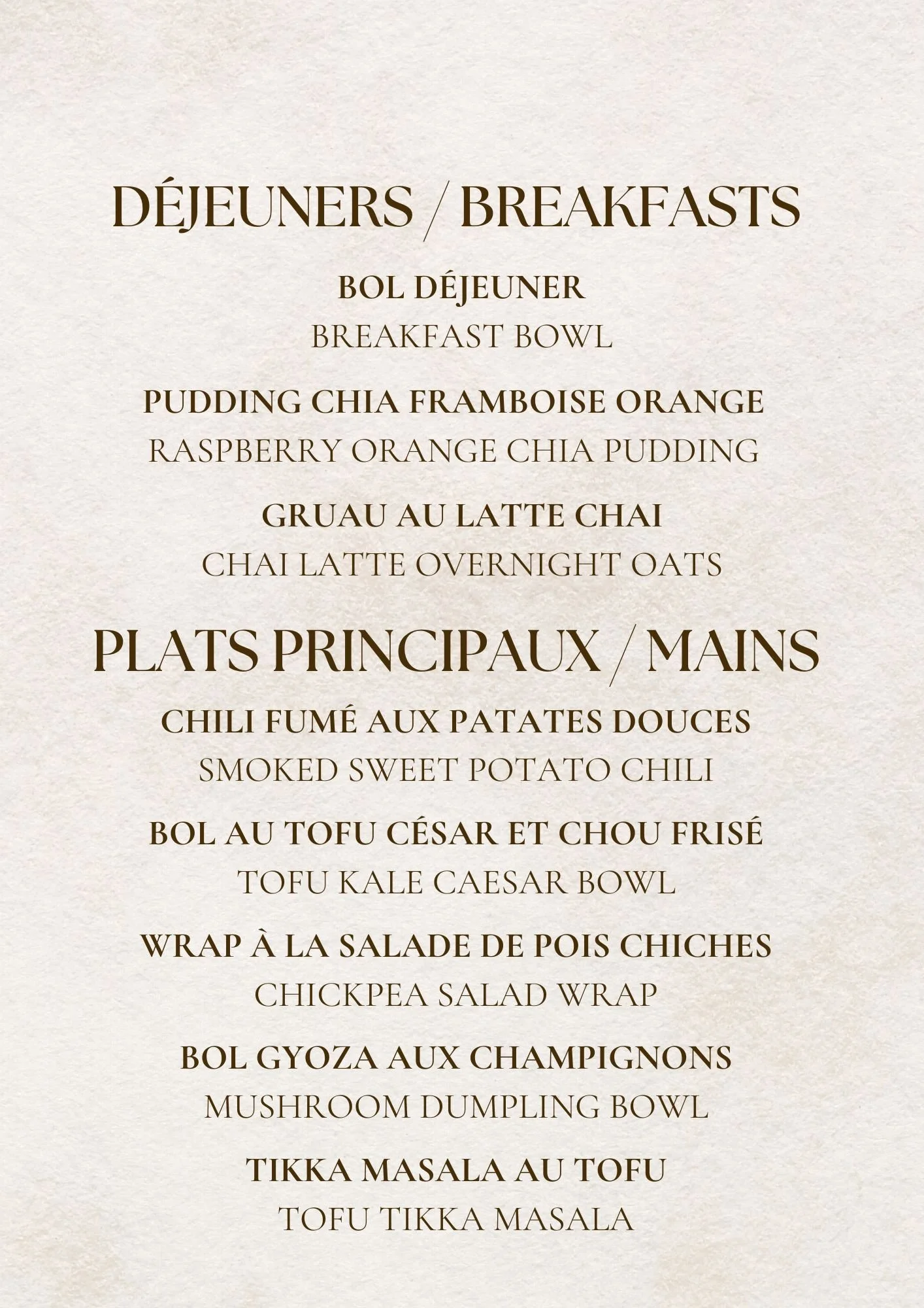 Veuillez noter que les ingrédients peuvent varier, car nous travaillons avec des fournisseurs locaux. Afin que nos chefs puissent répondre à vos besoins, veuillez indiquer toute allergie, intolérance ou préférence lors de votre commande.